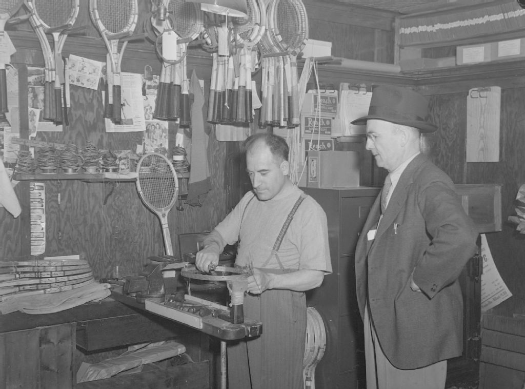 Feature. Tennis Racquet Restringing, 26 juin 1945, Archives nationales à Montréal, Fonds Conrad Poirier, (06M,P48,S1,P11857), Poirier, Conrad.