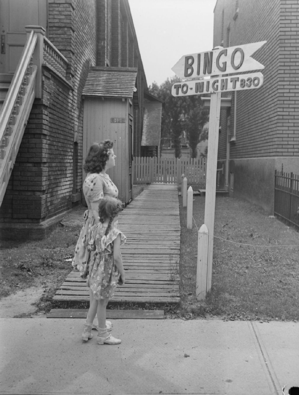 Une dame et une petite fille observent une flèche de signalisation indiquant le lieu et l'heure d'un bingo