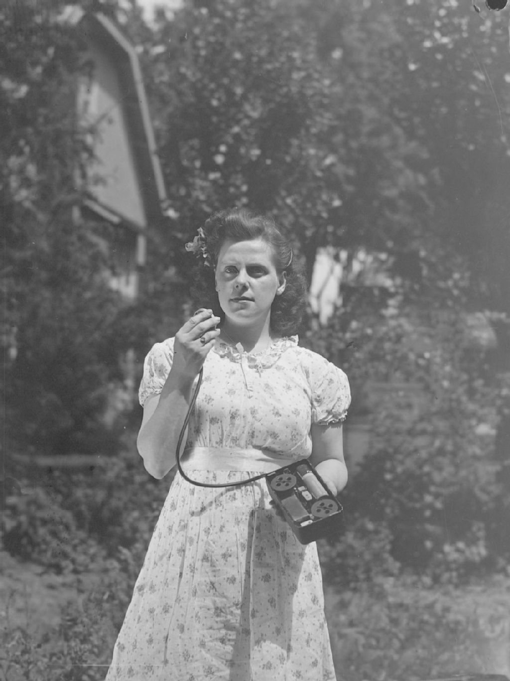 Fernande Lambert parle dans le microphone d'un magnétophone à ruban magnétique