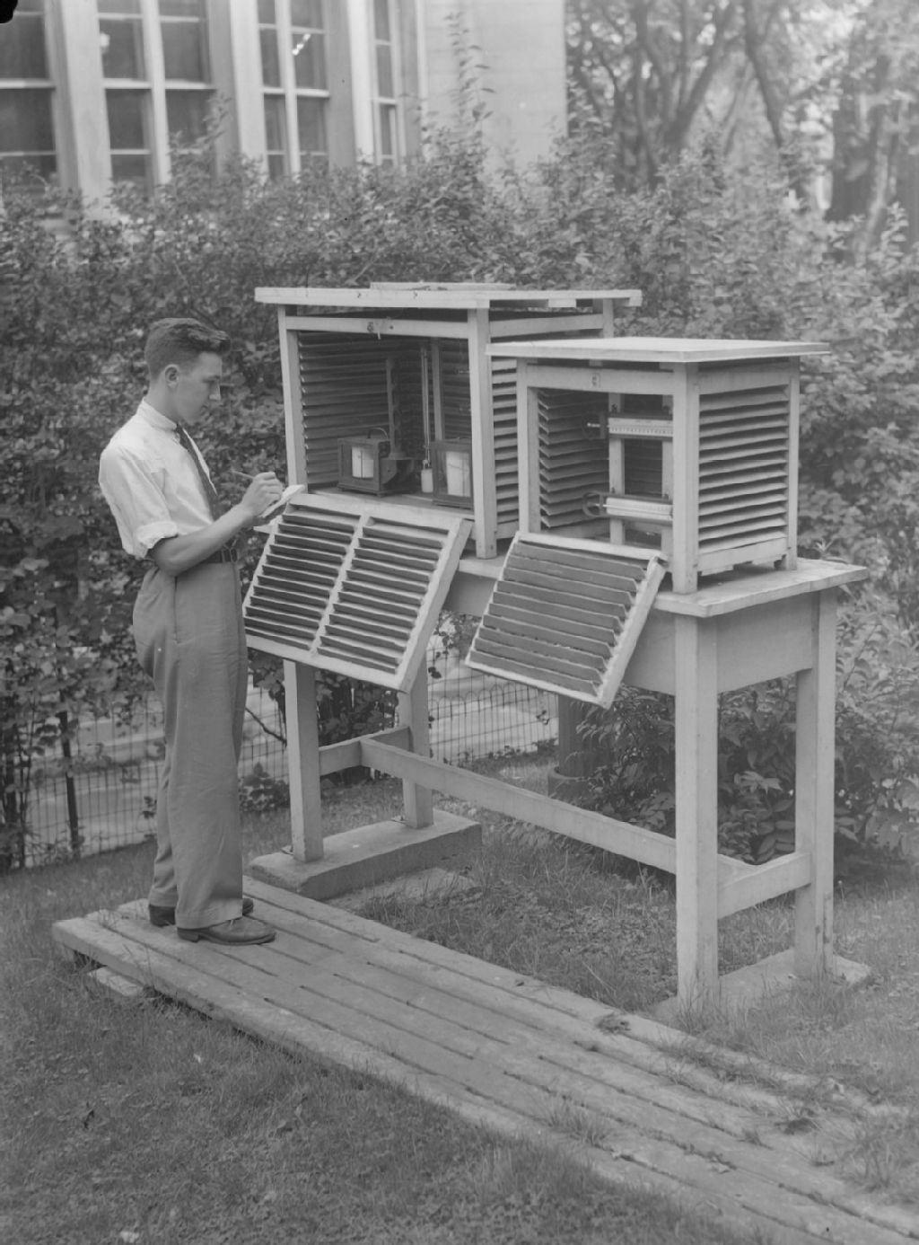 Raymond Morcel, technicien de l'observatoire météorologique de l'Université McGill, prend des relevés du baromètre enregistreur d'un abri météorologique. Un autre abri météorologique renferme deux thermomètres permettant de mesurer les températures minimums et maximums