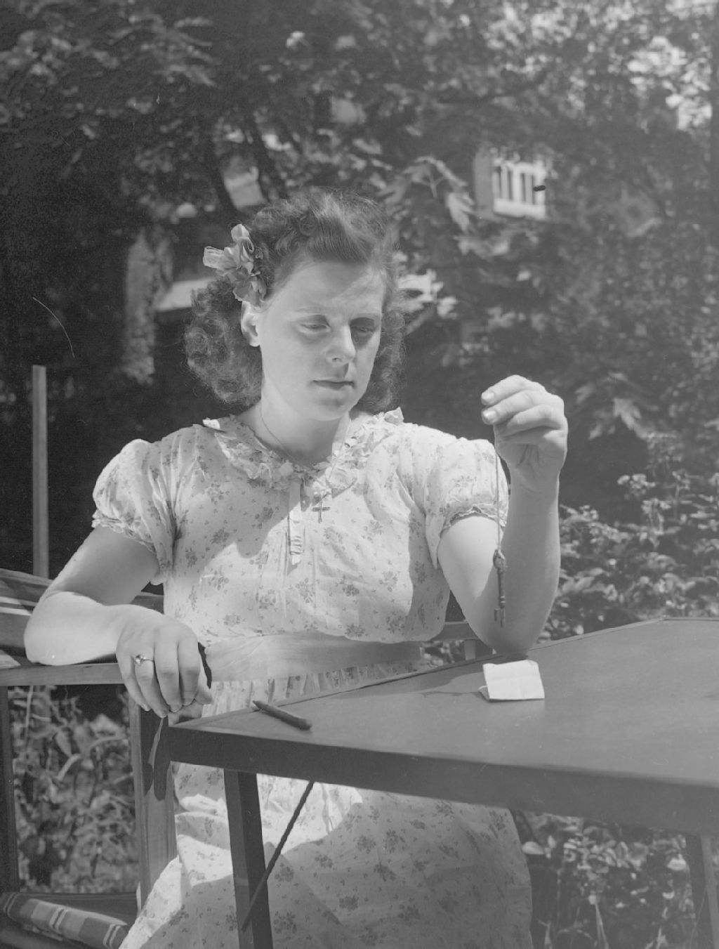 Fernande Lambert tient une clé au bout d'une ficelle attachée à son index. Elle semble la tenir au-dessus d'un aimant