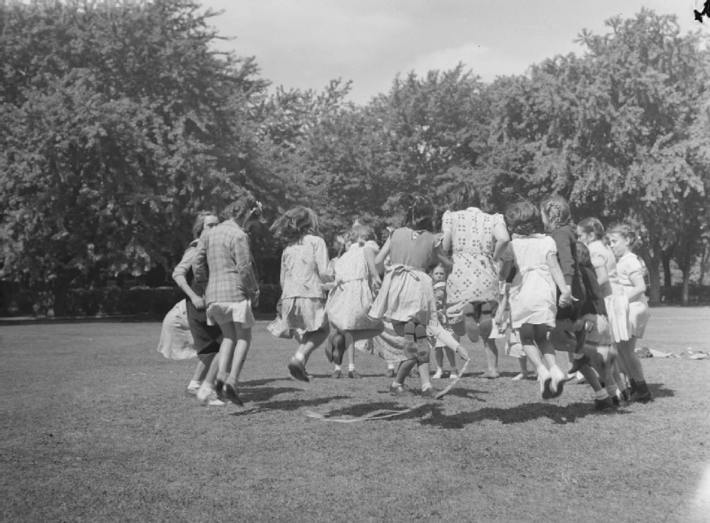 Un groupe de jeunes filles, debout en cercle, se tiennent par la main et sautent à pieds joints au-dessus d'un ruban que fait passer sous leurs pieds la fille au centre