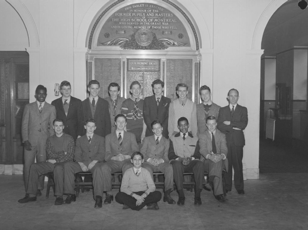 Nous voyons un groupe de jeunes hommes devant une plaque commémorative portant l'inscription des noms des élèves de The High School of Montreal morts pendant la guerre de 1914-1918