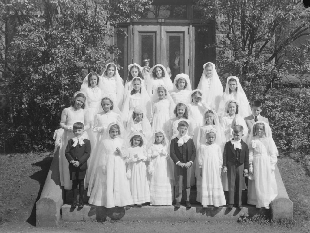 Nous voyons un groupe d'élèves du primaire du Collège Marie-de-France situé chemin Queen-Mary à Montréal. Les petites filles portent des robes longues et un voile, les petits garçons sont en costume avec noeud de ruban au cou