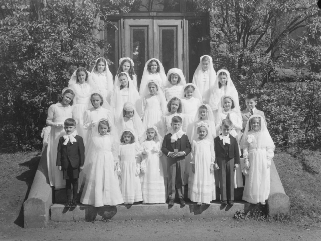 Nous voyons un groupe d'élèves du primaire du Collège Marie-de-France situé chemin Queen-Mary à Montréal. Les petites filles portent des robes longues et un voile, les petits garçons sont en costume avec noeud de ruban au cou