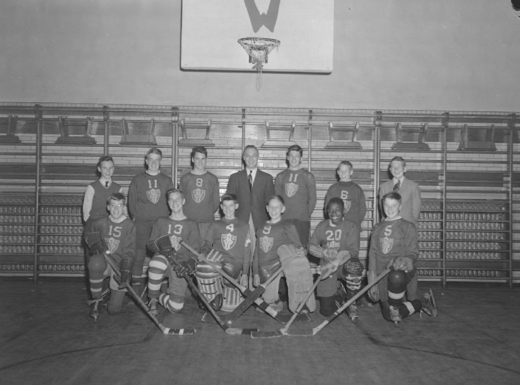 Nous voyons les joueurs et l'entraîneur de l'équipe de hockey de Westmount Junior High School