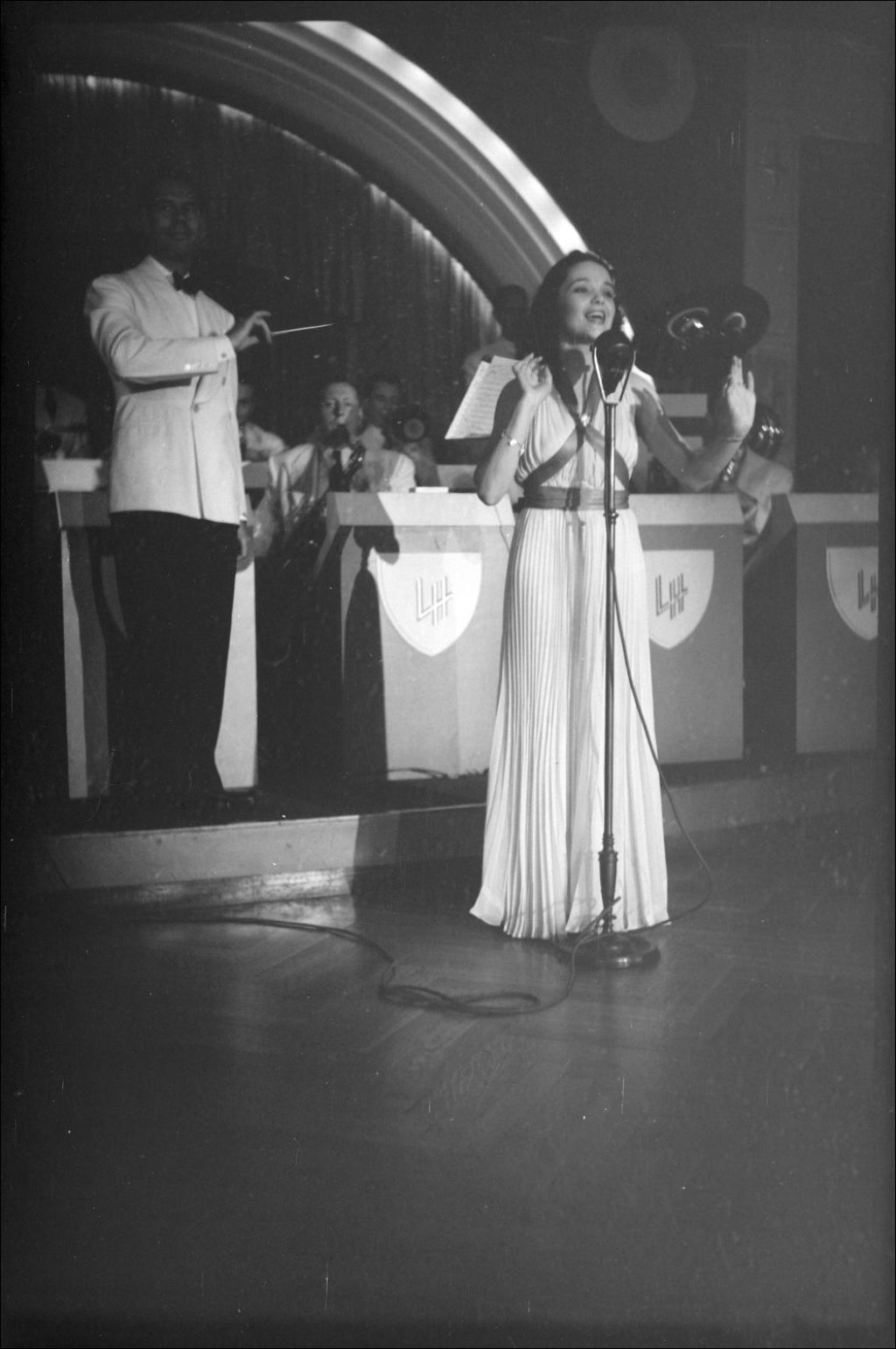 Nous voyons la chanteuse Aurelia Colom en spectacle au cabaret "Normandie Roof". Derrière la chanteuse, nous voyons le chef d'orchestre et ses musiciens