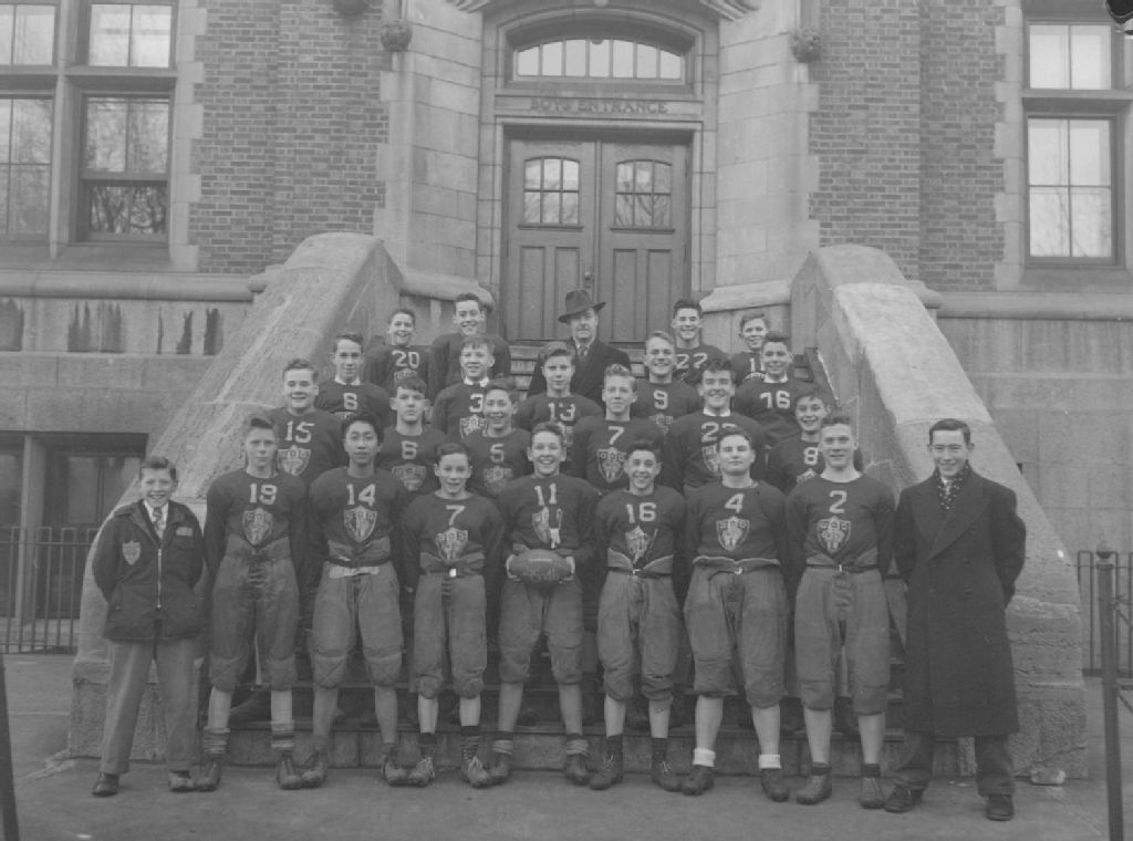 Nous voyons les joueurs et les entraîneurs de l'équipe de football de Westmount Junior High