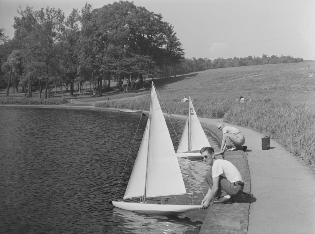 George Denate et Don Maxwell, du Club de modèles réduits de yachts de Montréal, font voguer leur voilier sur le bassin d'un parc