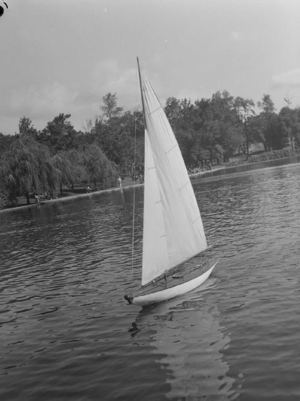 Le voilier de monsieur E. Lester Dun, membre du Club de modèles réduits de yachts de Montréal, vogue sur le bassin d'un parc