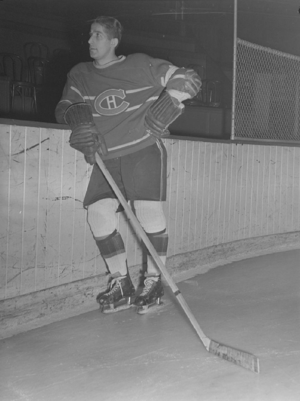 Nous voyons Elmer Lach, joueur de hockey du Canadien de Montréal. Il est sur la glace, appuyé à la bande