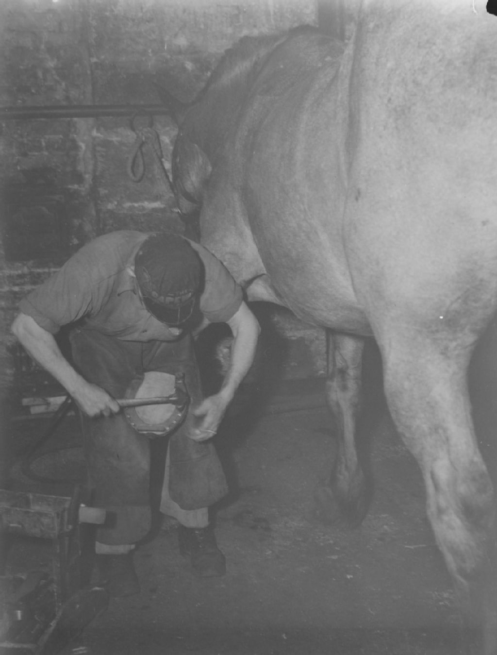 Horse. Horse Shoeing : Mr. Grant, 24 août 1945, Archives nationales à Montréal, Fonds Conrad Poirier, (06M,P48,S1,P12169), Poirier, Conrad.
