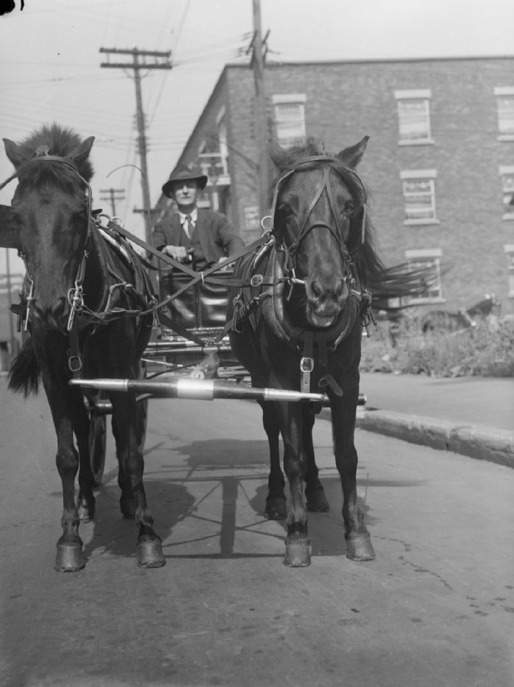 Georges Bleau conduit, dans une rue de Montréal, une charrette anglaise à quatre roues tirée par deux chevaux