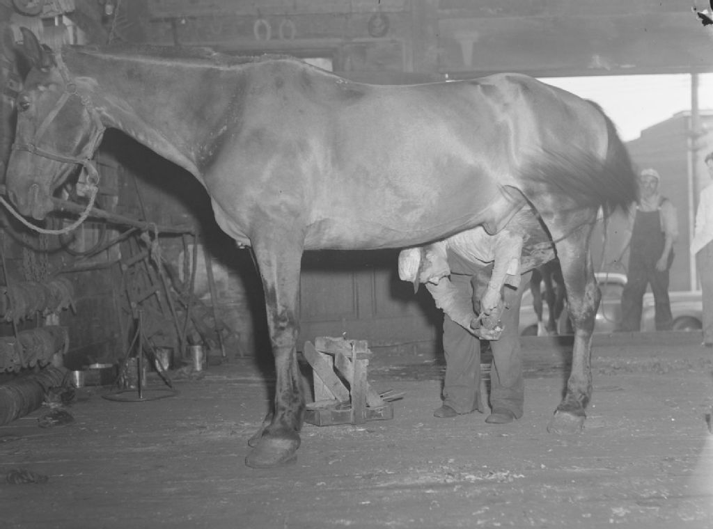 Horse. Blacksmith, 13 septembre 1945, Archives nationales à Montréal, Fonds Conrad Poirier, (06M,P48,S1,P12177), Poirier, Conrad.