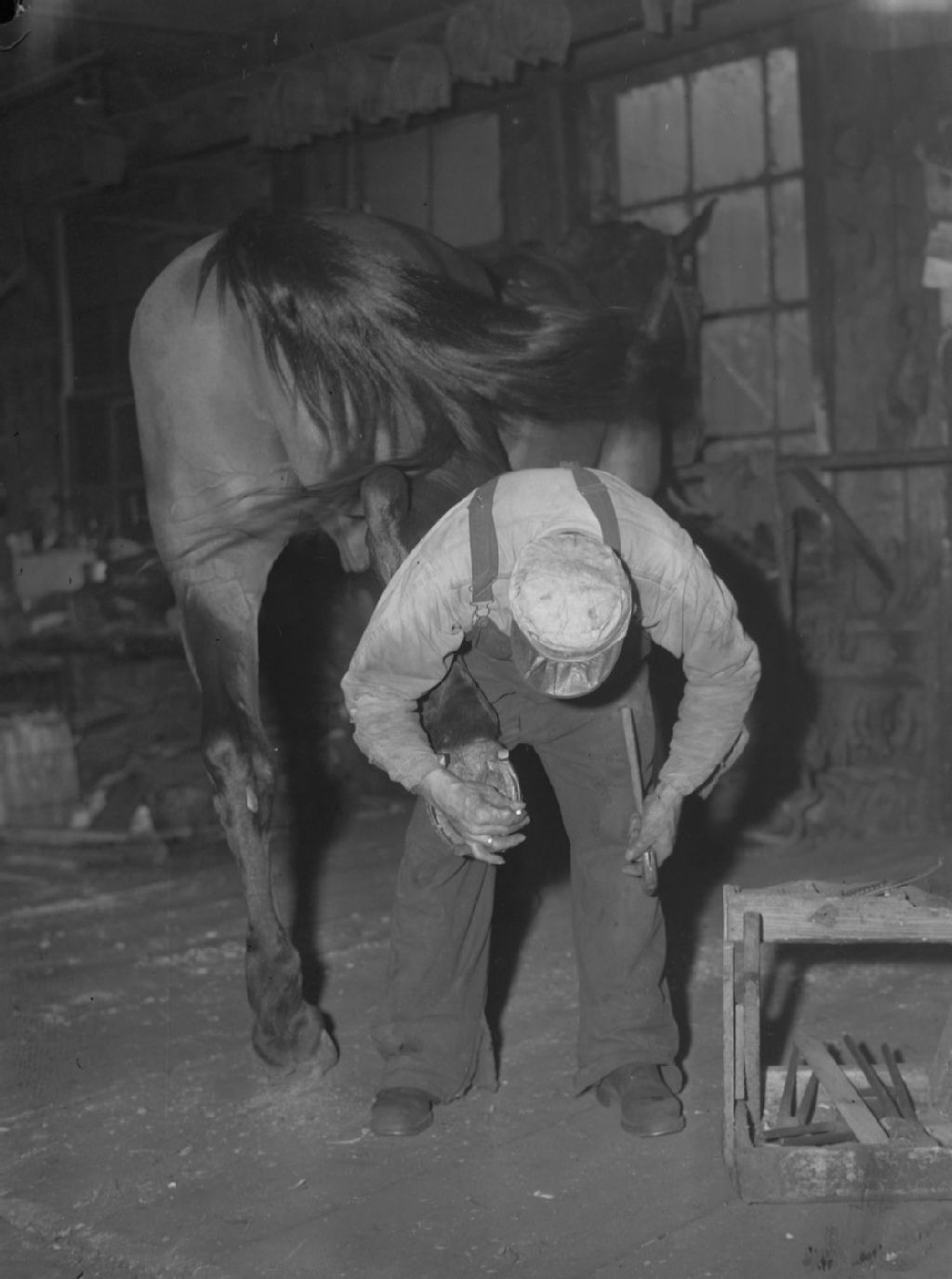 Horse. Horse at 4885 St. James. Blacksmith, 13 septembre 1945, Archives nationales à Montréal, Fonds Conrad Poirier, (06M,P48,S1,P12184), Poirier, Conrad.