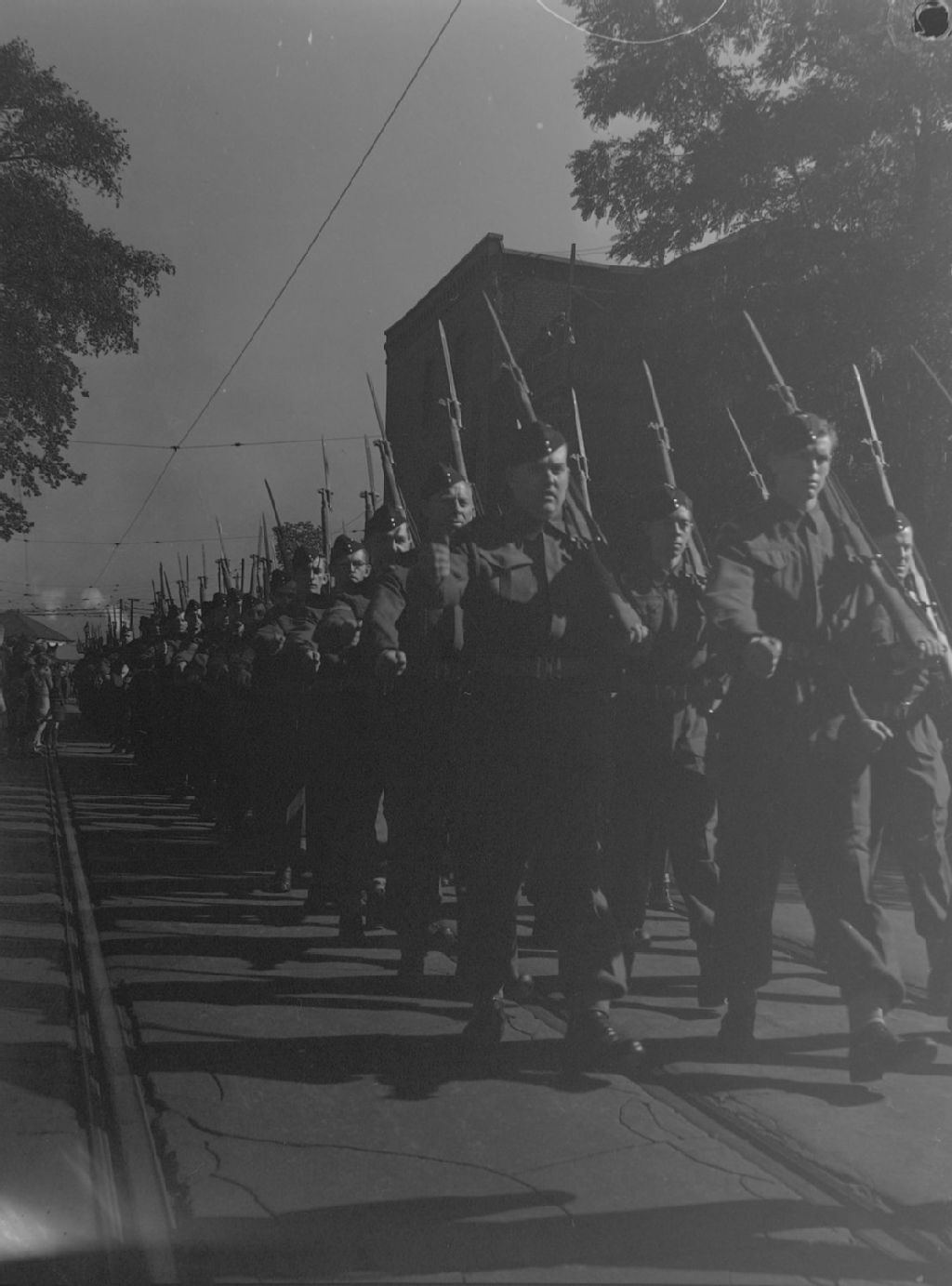 Les soldats du régiment The Royal Montreal Regiment défilent, fusil à l'épaule, à l'issue de la cérémonie de bienvenue