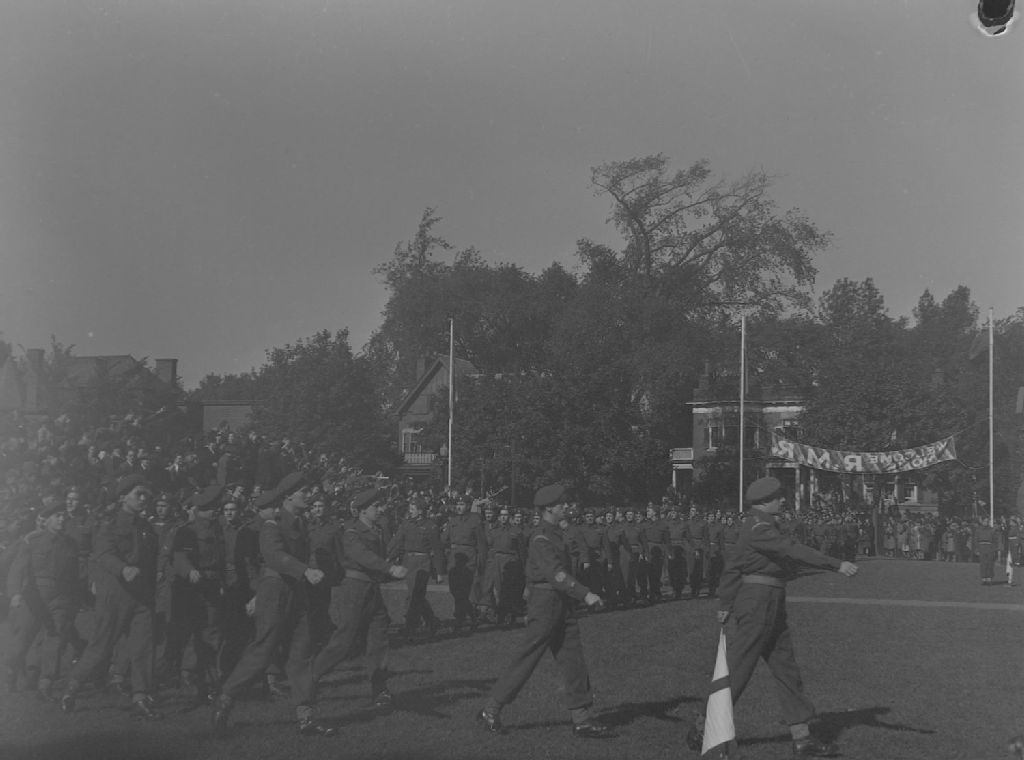 Les soldats du régiment The Royal Montreal Regiment font un défilé à l'issue de la cérémonie de bienvenue. À l'arrière-plan nous voyons une banderole avec l'inscription «Welcome Home R. M. R.»