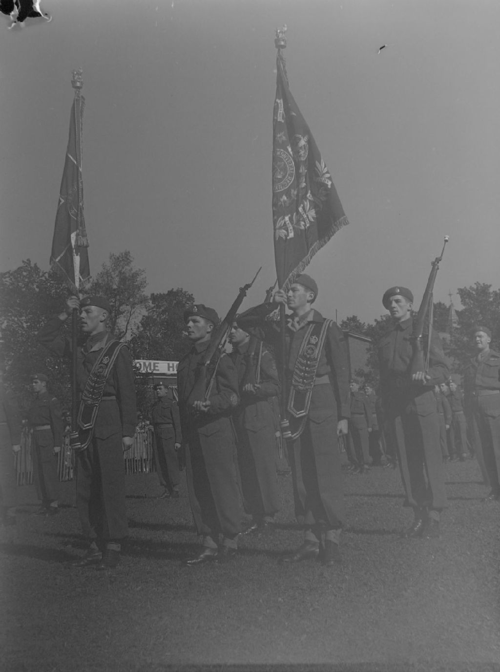 Les soldats du régiment The Royal Montreal Regiment restent au garde-à-vous lors de la cérémonie de bienvenue en plein air. À l'avant-plan, se tiennent deux porte-étendards