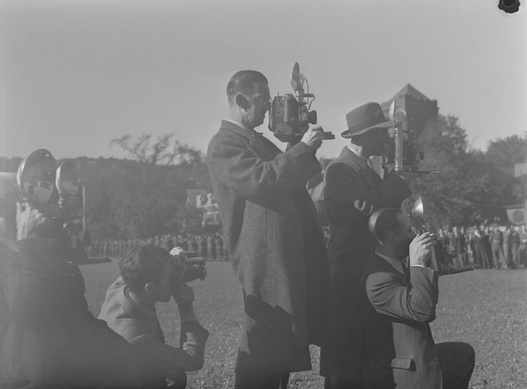Plusieurs photographes prennent des photos de la cérémonie de bienvenue des soldats du régiment The Royal Montreal Regiment