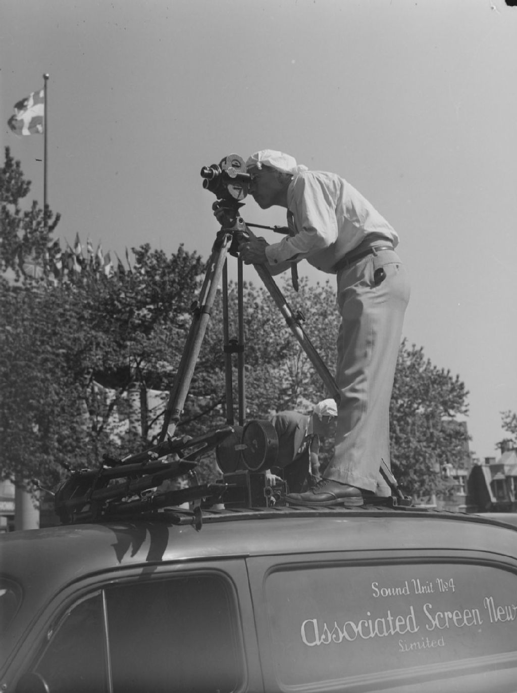 Nous voyons un cameraman filmant le défilé de la Saint-Jean-Baptiste à Montréal. Il est debout sur le toit d'une fourgonnette de Associated Screen News, sa caméra fixée sur un trépied
