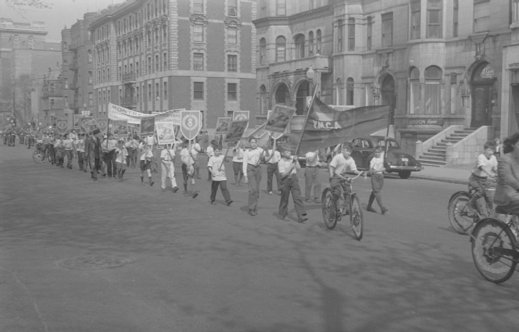 Des jeunes de la Young Men's Christian Association (YMCA) de Montréal participent au défilé de la Saint-Jean-Baptiste à Montréal. Ils tiennent des pancartes de la semaine des garçons et des filles et des obligations de la Victoire. Ils passent devant la boutique Ruth Gordon Gowns, rue Sherbrooke Ouest