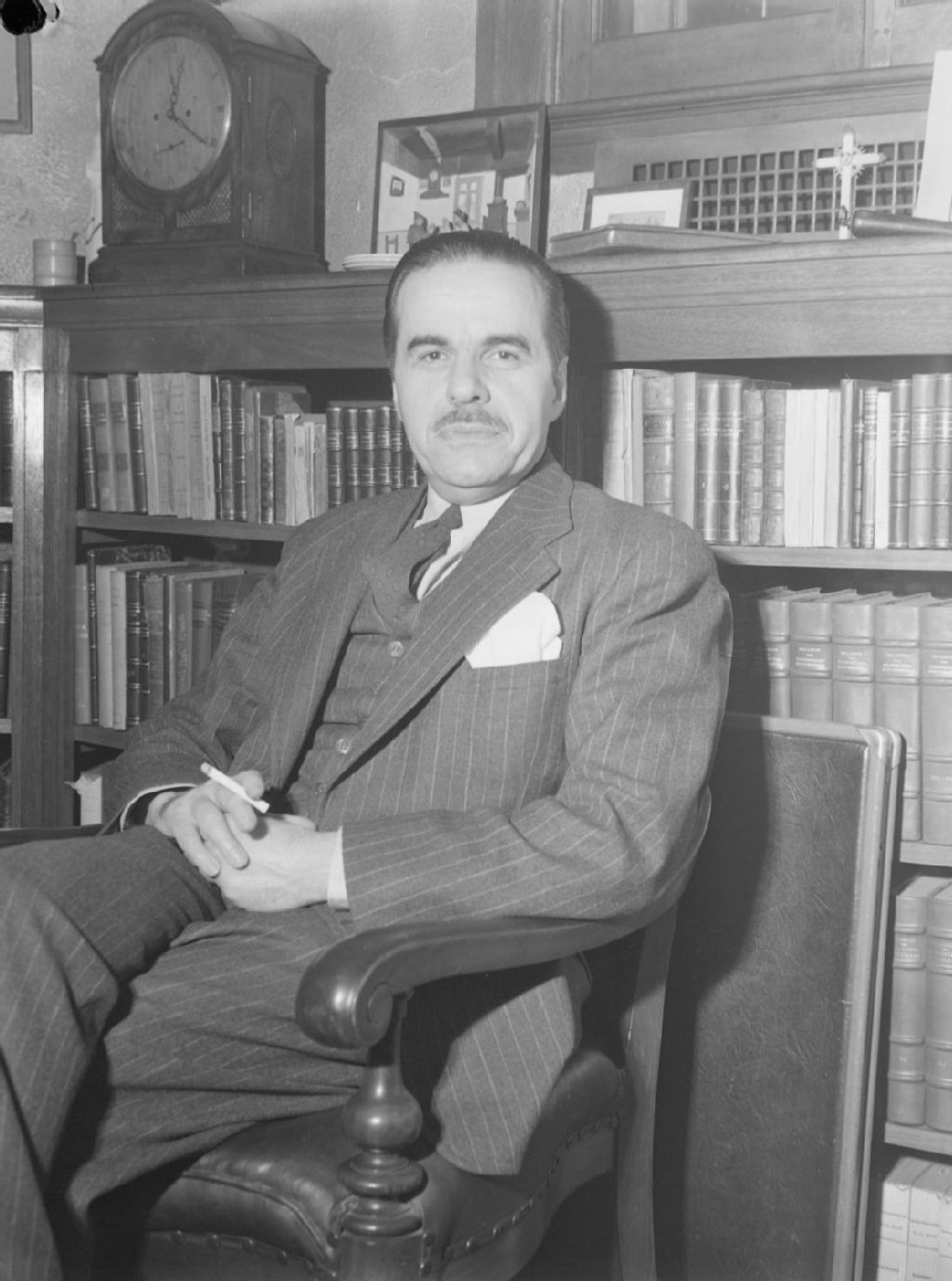 Nous voyons l'avocat Paul Gouin domicilié sur l'avenue Prince-Albert à Westmount. Il est assis dans un fauteuil devant une bibliothèque