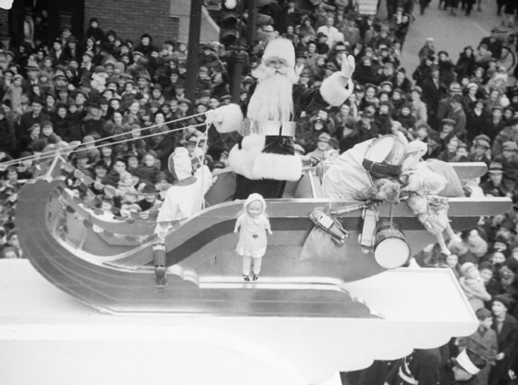 Nous voyons le père Noël debout dans son traîneau plein de jouets lors du défilé du père Noël à Montréal