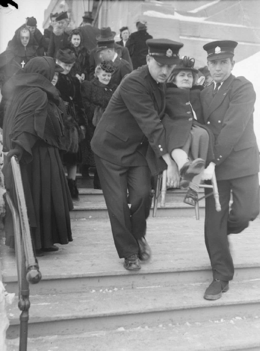 Deux policiers transportent une paraplégique assise sur une chaise à l'extérieur de l'oratoire Saint-Joseph où une messe pour les malades a été célébrée
