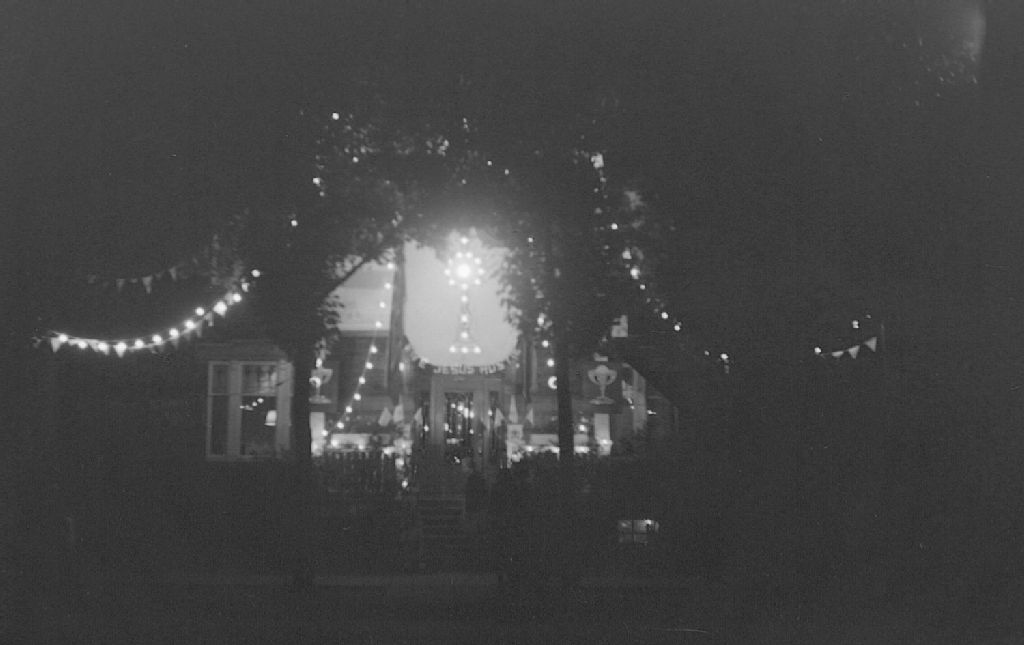 Nous voyons une résidence décorée de lumières, de drapeaux et de symboles religieux pour le congrès eucharistique de Rosemont