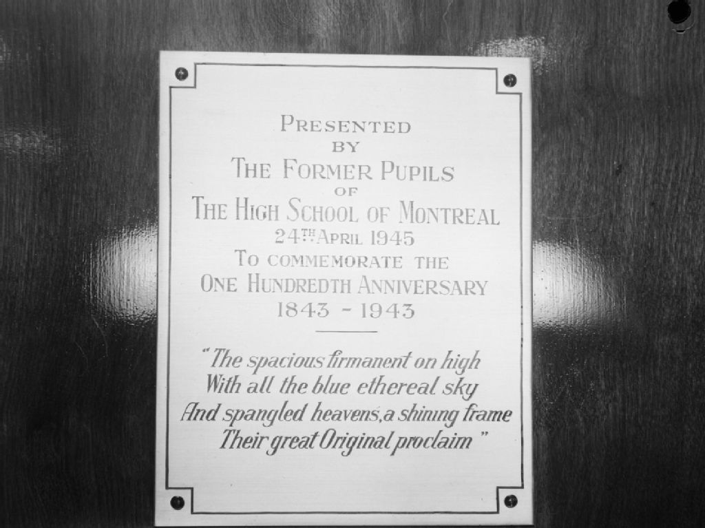 Nous voyons une plaque commémorative présentée par les anciens élèves de The High School of Montreal pour souligner le centième anniversaire de l'institution (1843-1943)