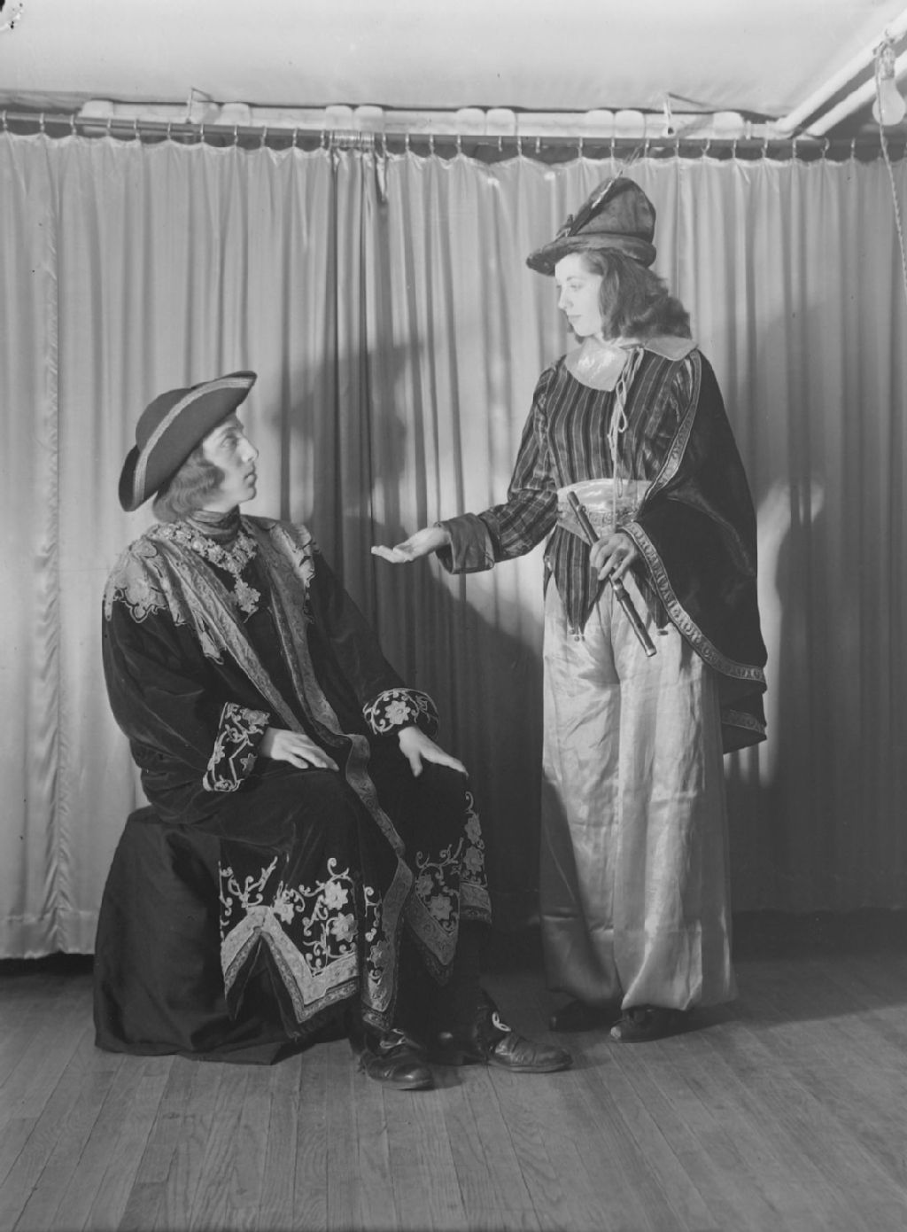 Nous voyons deux acteurs costumés lors d'une représentation de la pièce de théâtre pour enfants Le joueur de flûte de Hamelin d'après le poème de Robert Browning. La joueuse de flûte tend la main vers un homme richement vêtu pour se faire payer