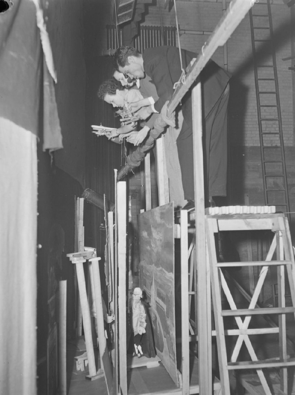 Nous voyons les marionnettistes tirant sur les fils des marionnettes du spectacle pour enfants Bastien et Bastienne d'après l'opéra de Mozart