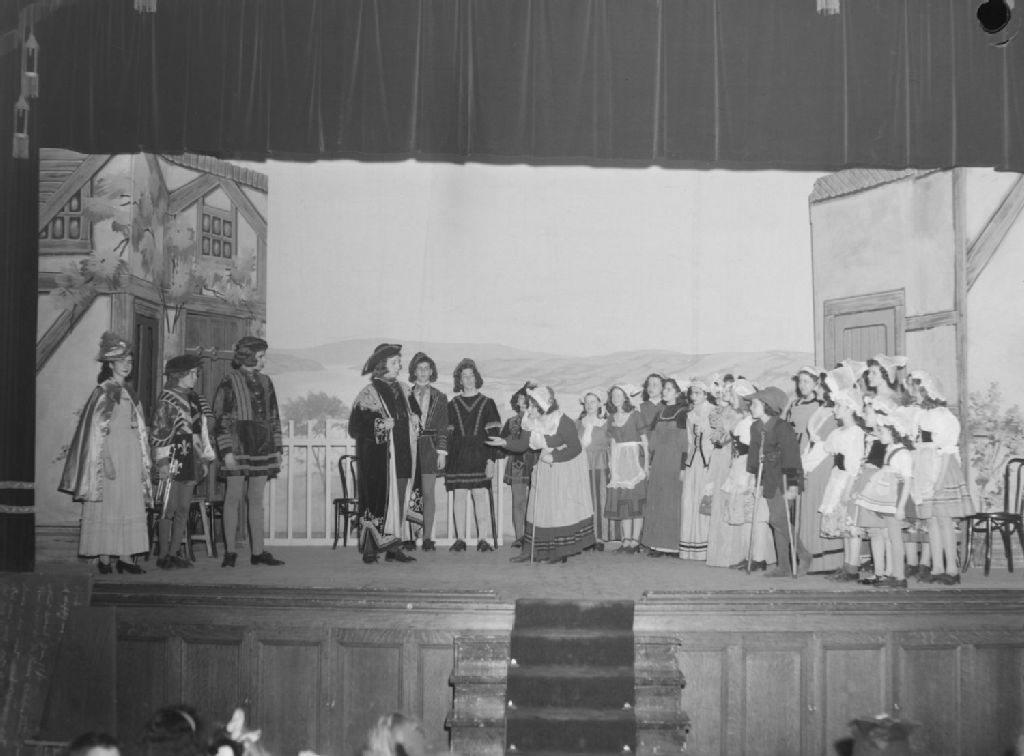 Nous voyons les acteurs costumés sur la scène de la représentation de la pièce de théâtre pour enfants Le joueur de flûte de Hamelin d'après le poème de Robert Browning