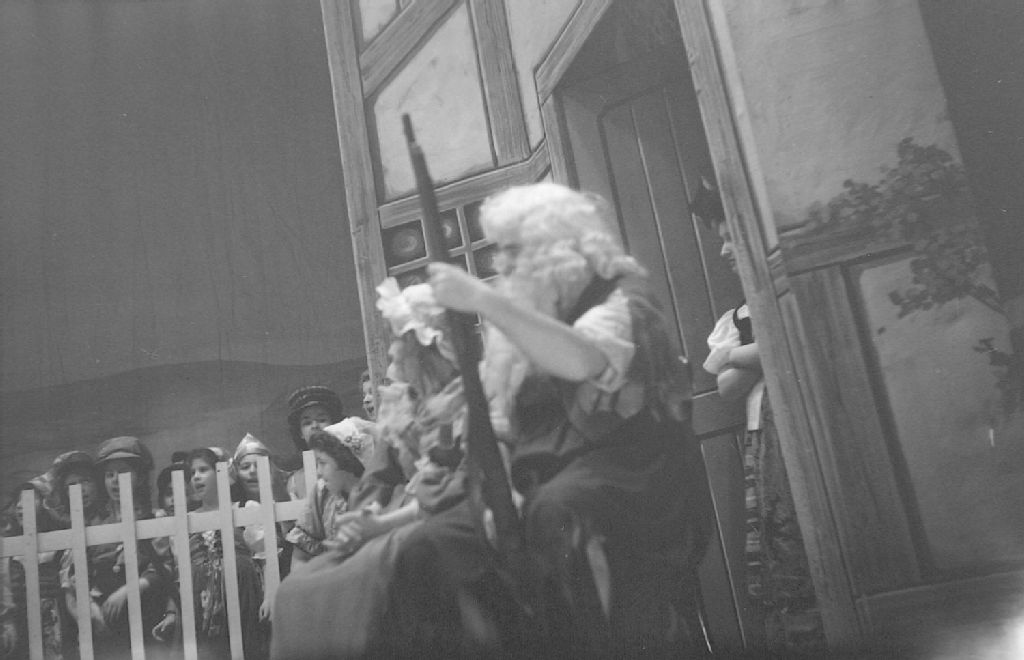 Nous voyons une scène d'une représentation de la pièce de théâtre pour enfants Rip van Winkle d'après le récit de Washington Irving. Un homme barbu tient un fusil