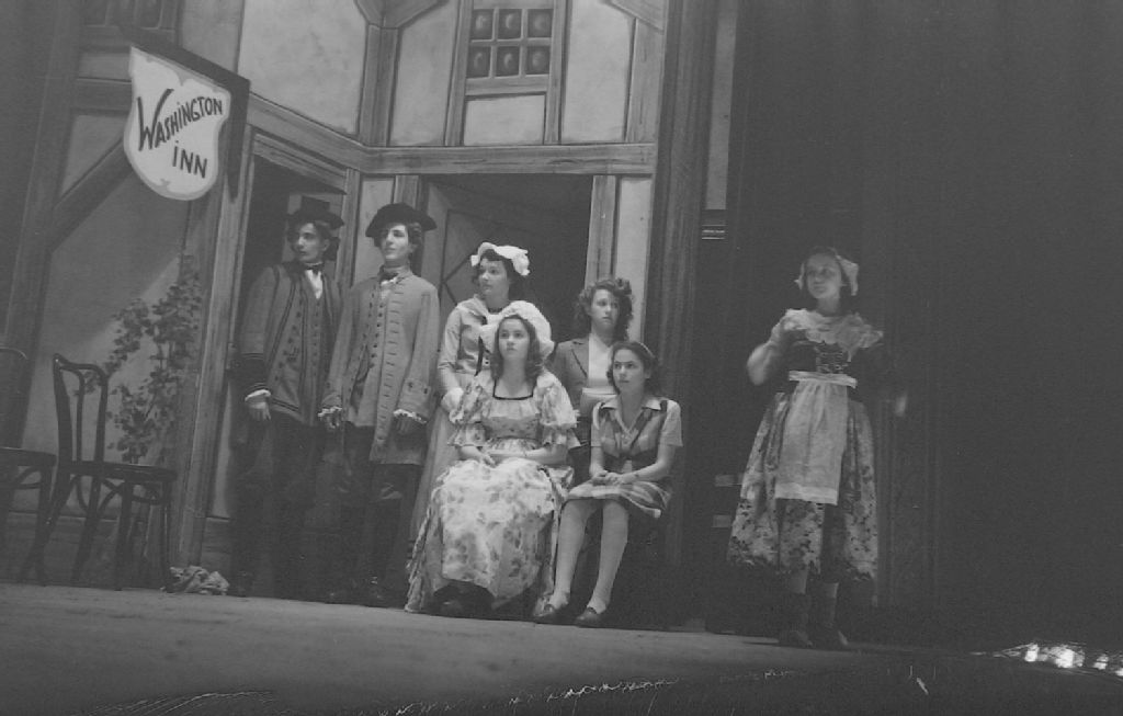 Nous voyons une scène d'une représentation de la pièce de théâtre pour enfants Rip van Winkle d'après le récit de Washington Irving. Les hommes portent un justaucorps et un tricorne