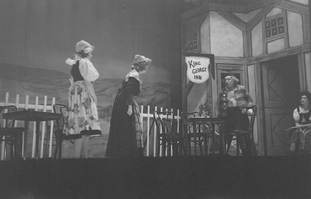 Nous voyons une scène d'une représentation de la pièce de théâtre pour enfants Rip van Winkle d'après le récit de Washington Irving. Les comédiens se tiennent sur la terrasse d'une auberge