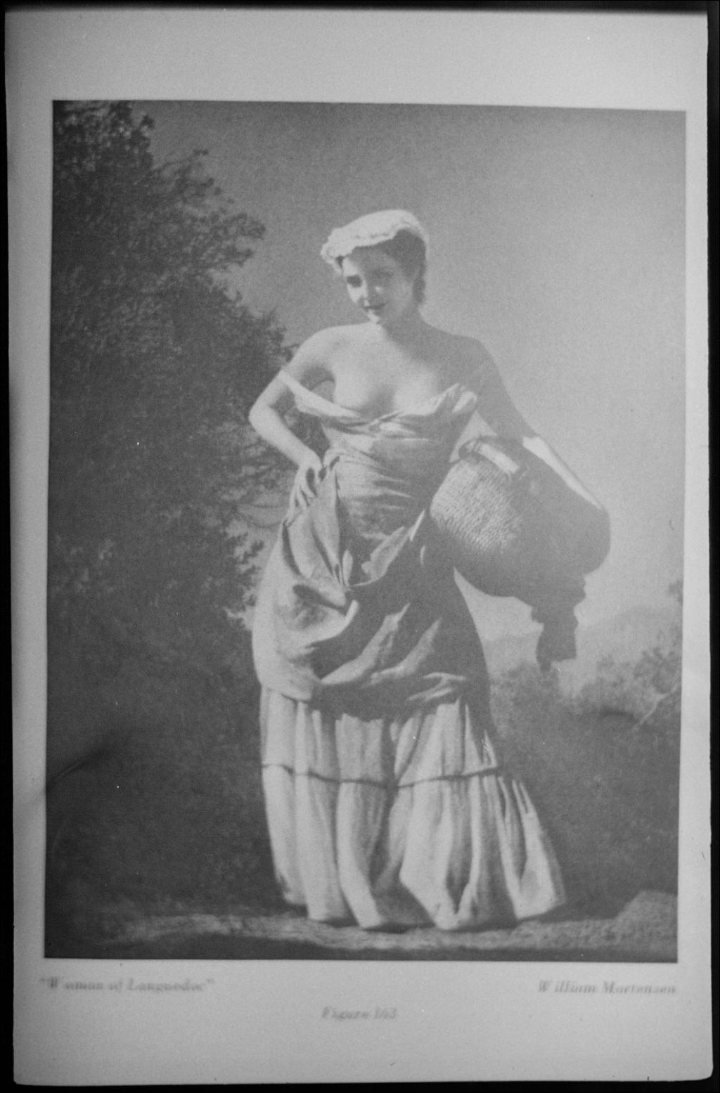 Reproduction d'une page de volume. Nous voyons une femme vêtue d'une robe longue à la mode paysanne, le corsage échancré. En bas de l'image, nous remarquons la mention Willam Mortensen