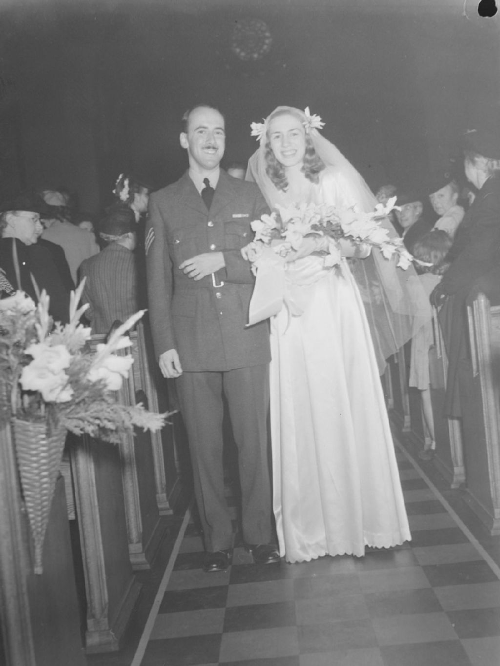 Les nouveaux mariés, Elizabeth Mildred Phillips et Gordon Bradshaw Clarke, marchent dans la nef de l'église où leur mariage a été célébré. Le marié porte l'uniforme militaire