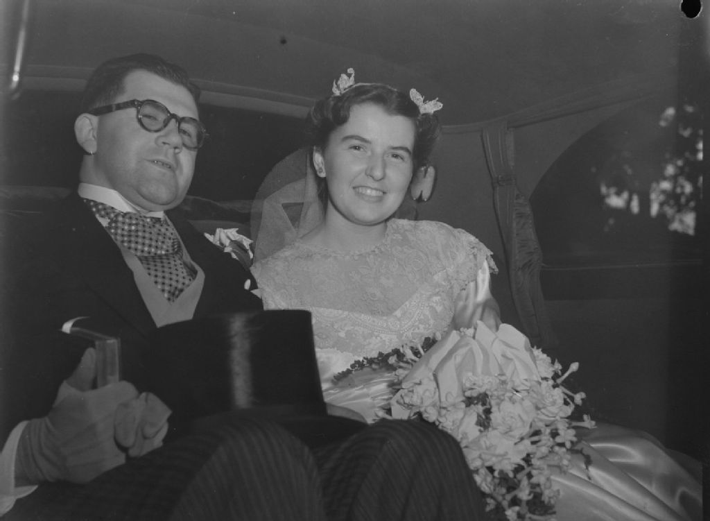 Les nouveaux mariés, Emelie Bourbonnière et Marcel Trahan, sont assis sur la banquette arrière d'une voiture. Monsieur Trahan tient un haut-de-forme sur ses genoux
