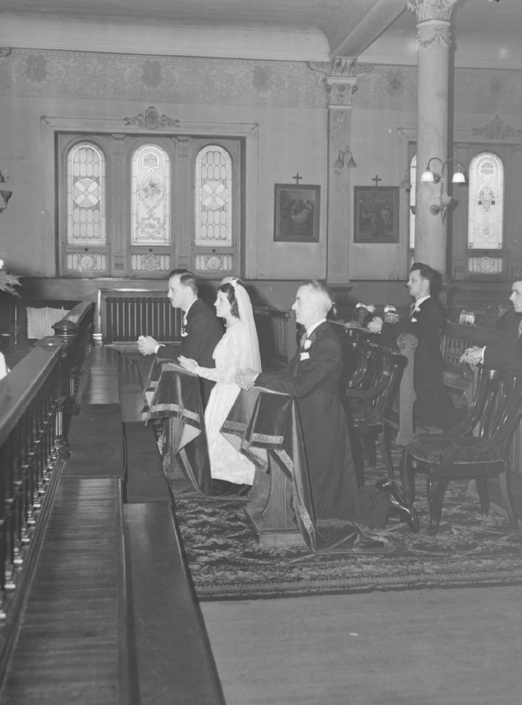 Les nouveaux mariés, Jean Langevin et Yvette Lamarre, sont agenouillés à des prie-Dieu près du choeur de l'église pendant la célébration de leur mariage