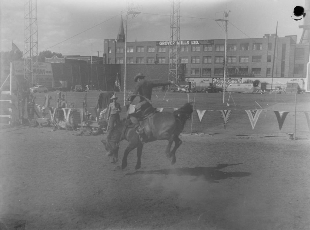 Un cheval sauvage décoche une ruade pour envoyer son cavalier par terre lors d'un rodéo présenté au stade Delorimier à Montréal. Nous remarquons la manufacture Grover Mills Ltd. Knit to Fit à l'arrière-plan