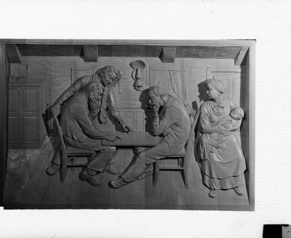 Nous voyons un tableau sculpté sur bois de Jean J. Bourgault représentant des joueurs de dames et une mère tenant son bébé emmailloté. Cette oeuvre fait partie de la collection de Paul Ostiguy