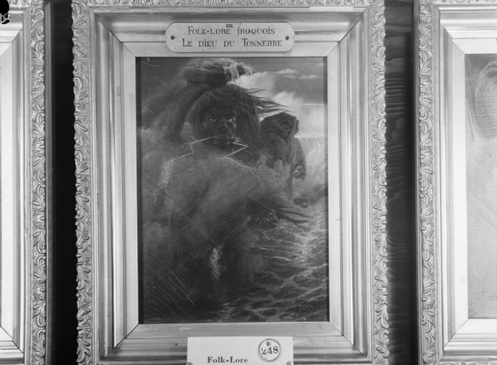Nous voyons une peinture du père Arthur Guindon p.s.s. représentant une scène du folklore iroquois, Le dieu du tonnerre. Cette huile est exposée au musée de la basilique Notre-Dame