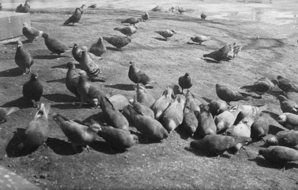 Bird. Pidgeons in Dominion Square, 15 mars 1946, Archives nationales à Montréal, Fonds Conrad Poirier, (06M,P48,S1,P12831), Poirier, Conrad.
