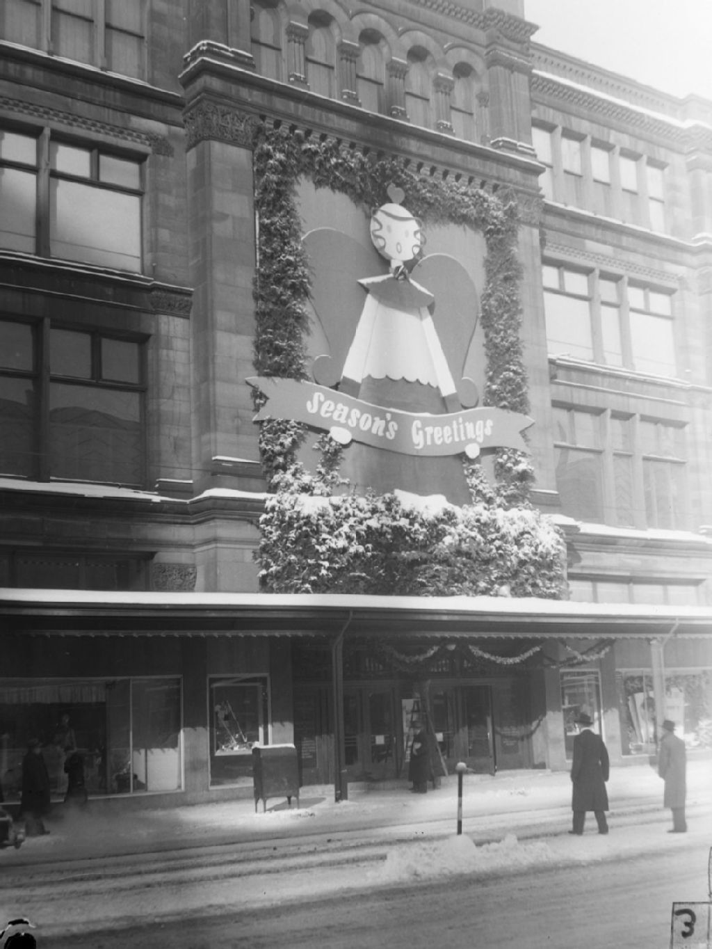Nous la façade du magasin à rayons Morgan's situé rue Sainte-Catherine Ouest à Montréal. Elle est décorée d'un ange avec l'inscription Season's Greetings
