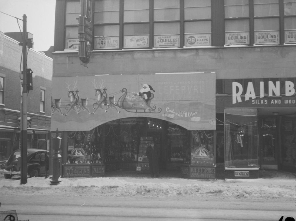 Nous voyons le Marché de chaussures Lefebvre dont la façade est décorée du traîneau du père Noël tiré par deux rennes. Ce commerce est situé sur la rue Sainte-Catherine Est à Montréal