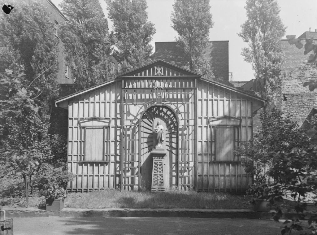Nous voyons une statue du Sacré-Coeur dans une niche d'un petit bâtiment du jardin du séminaire de Saint-Sulpice situé près de la basilique Notre-Dame à Montréal
