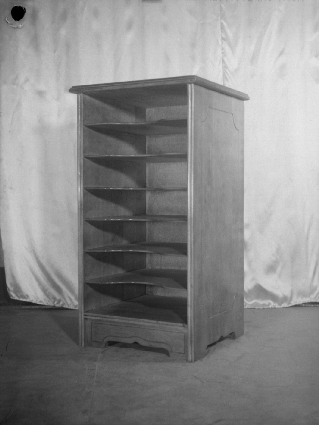 Nous voyons un meuble de rangement à plusieurs tablettes manufacturé chez American Frame Mfg Co de l'avenue Henri-Julien à Montréal