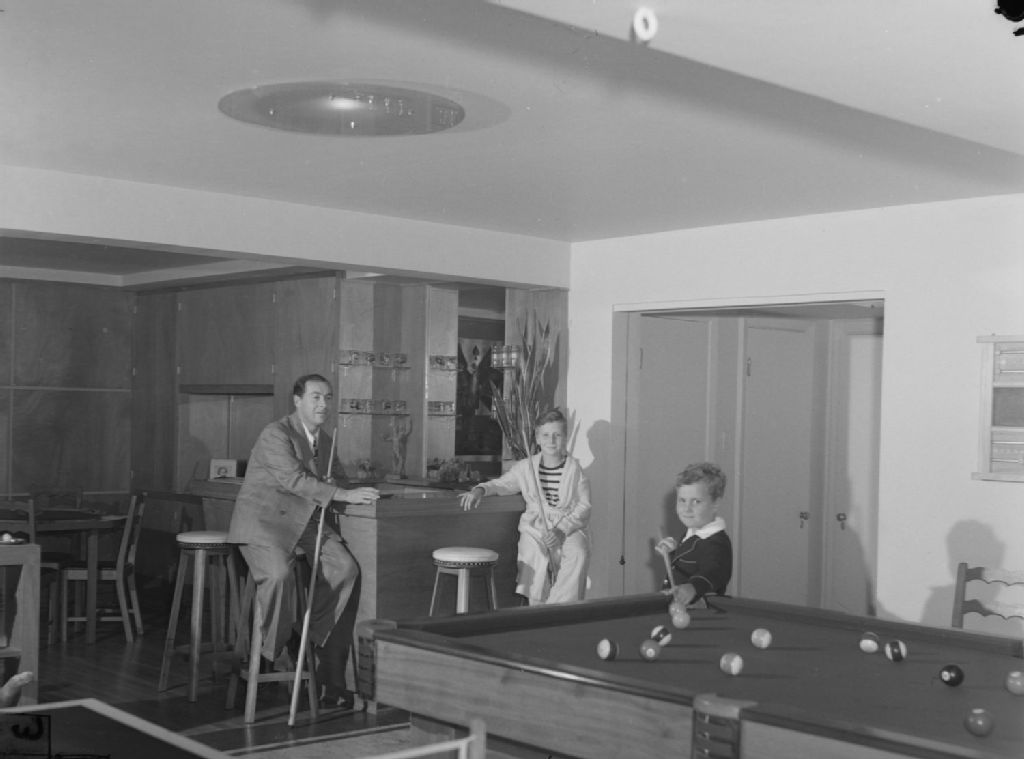 Le joaillier Gabriel L. Lucas joue au billard avec ses deux fils dans la salle de séjour de la résidence familiale