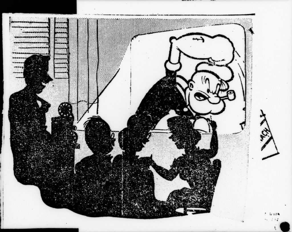 Nous voyons une photographie d'un dessin du personnage d'animation Popeye le marin. Nous voyons les silhouettes d'un projectionniste et de spectateurs au premier plan